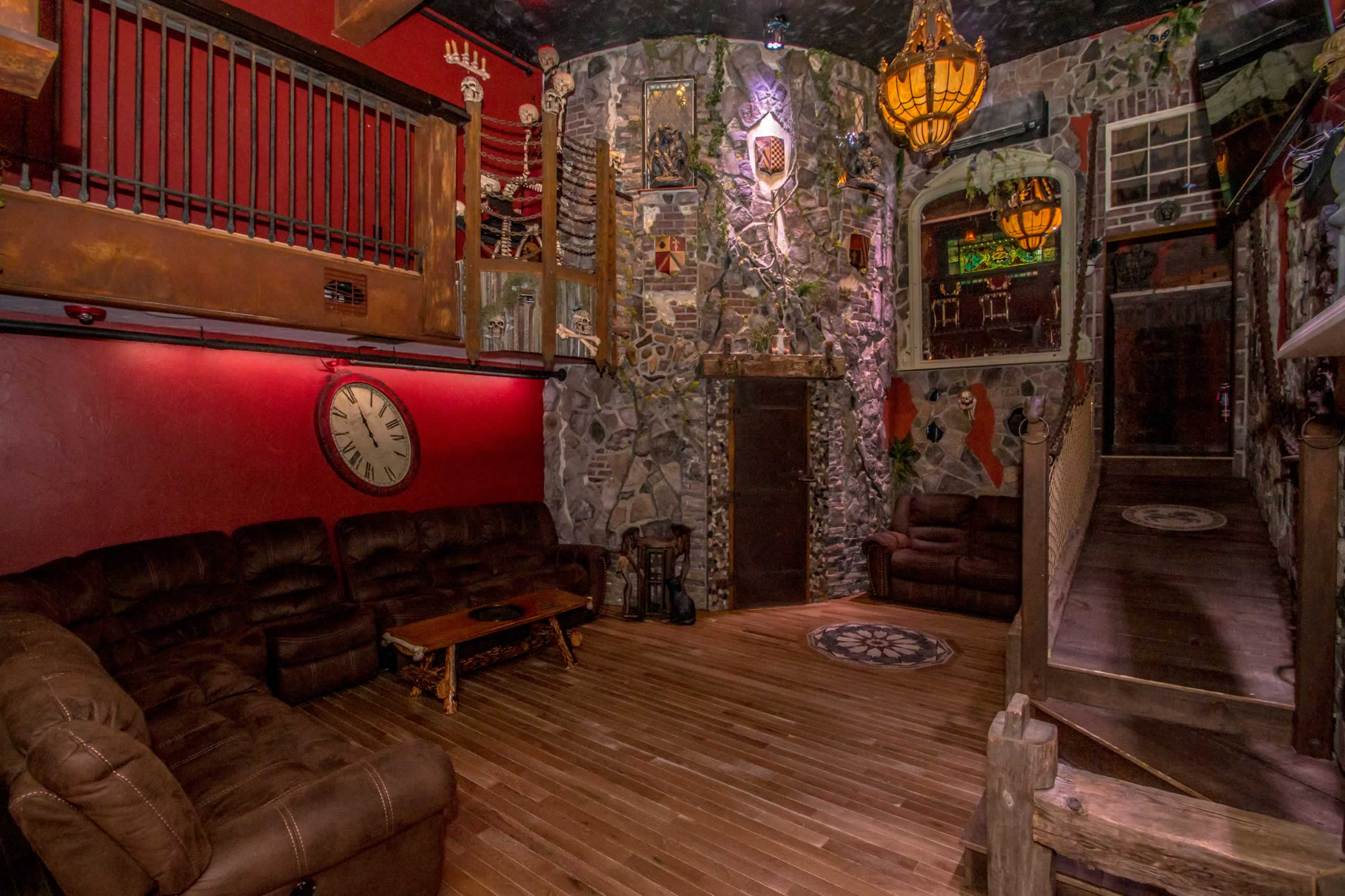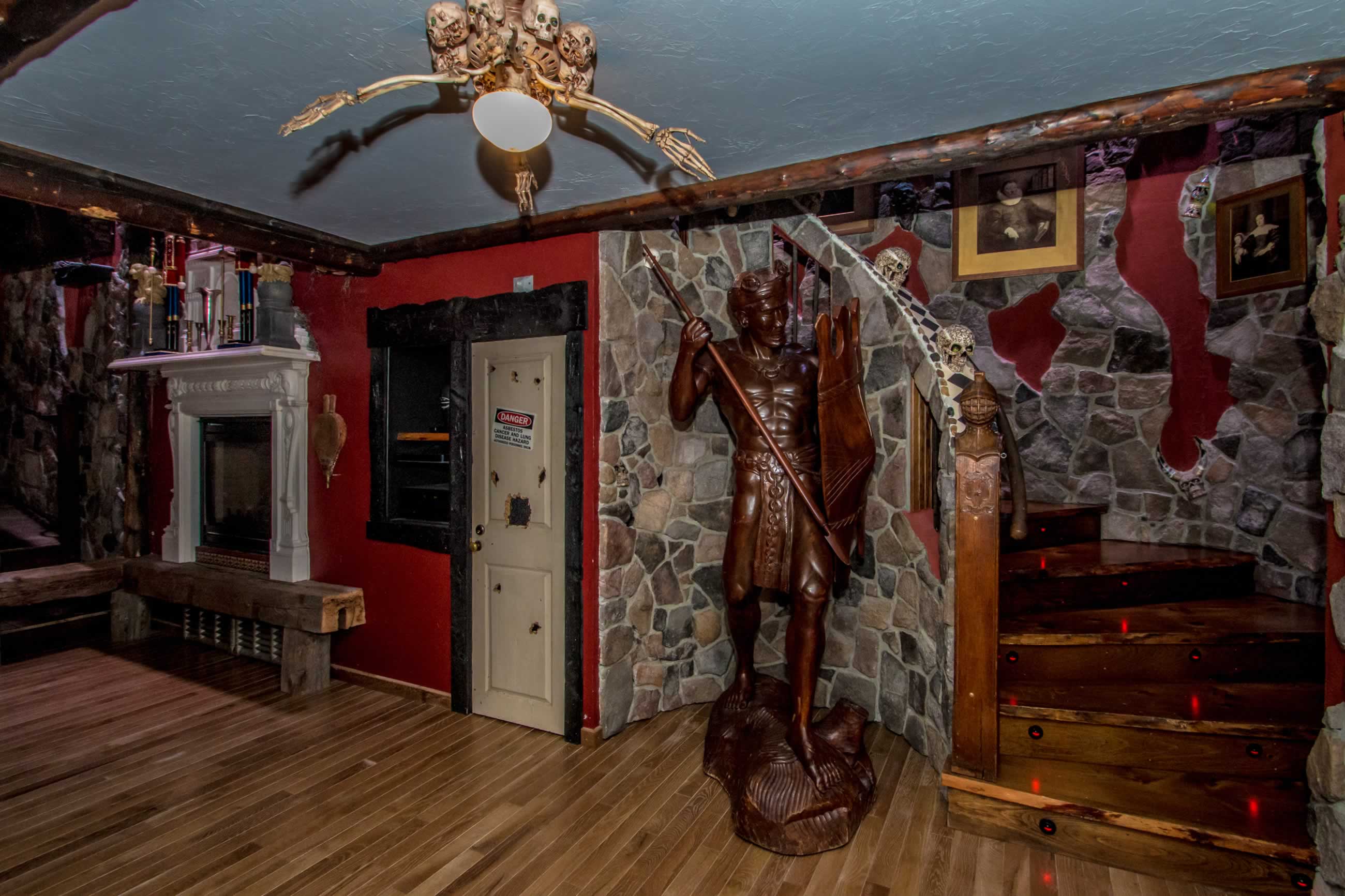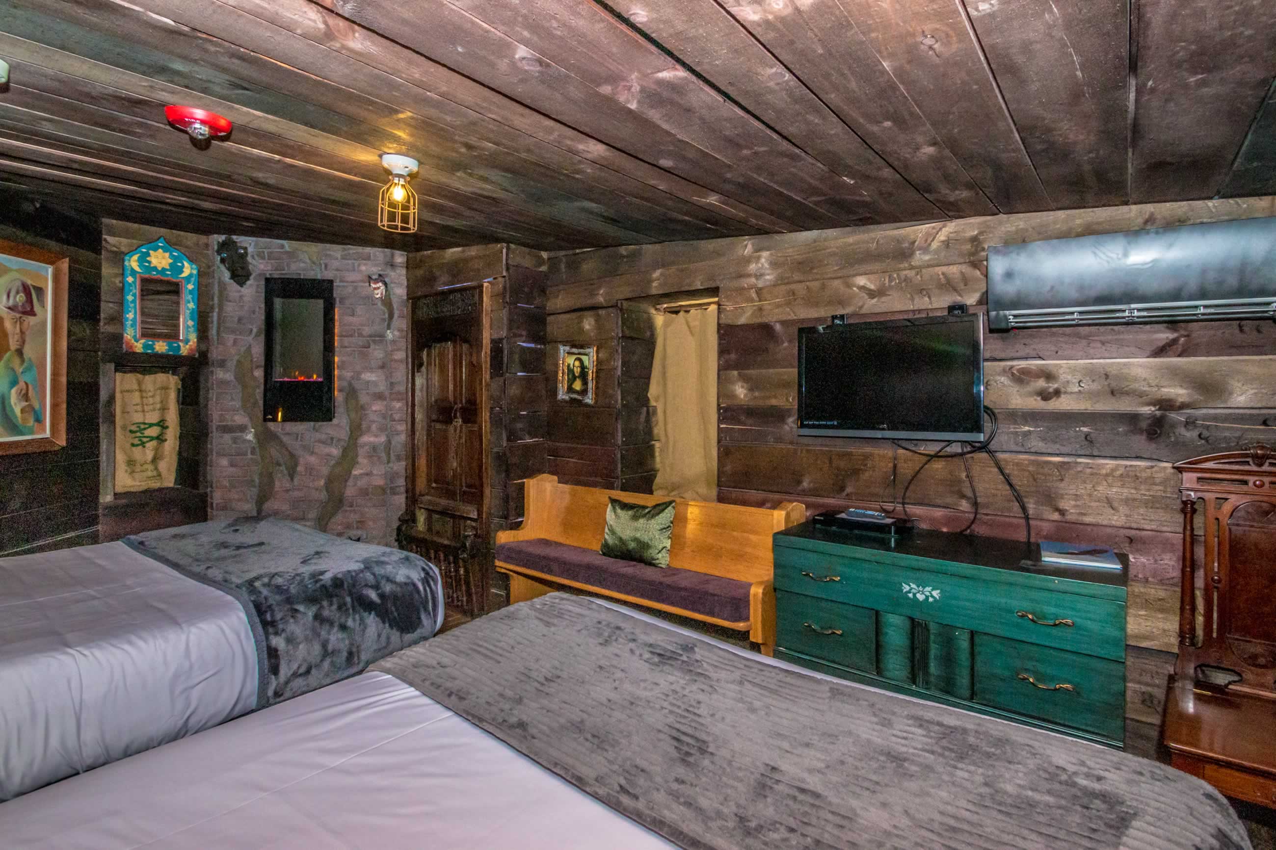 No expense has been spared in this project. Features includes a gangway bar overlooking the living area, 5 person, second story outdoor (covered) hot tub, the Kings "bone throne", 2 fireplaces, 3 bathrooms, sound-proof walls, a draw bridge leading to the 3 bedrooms (including the 3 tier Dormitorium), a full kitchen with a Kings' table, and unbelievable castle architecture...but this isn't the only reason you rent this amazing suite that sleeps up to 18 earthly people...It's because you WILL experience a haunting sensation .... GUARANTEED.