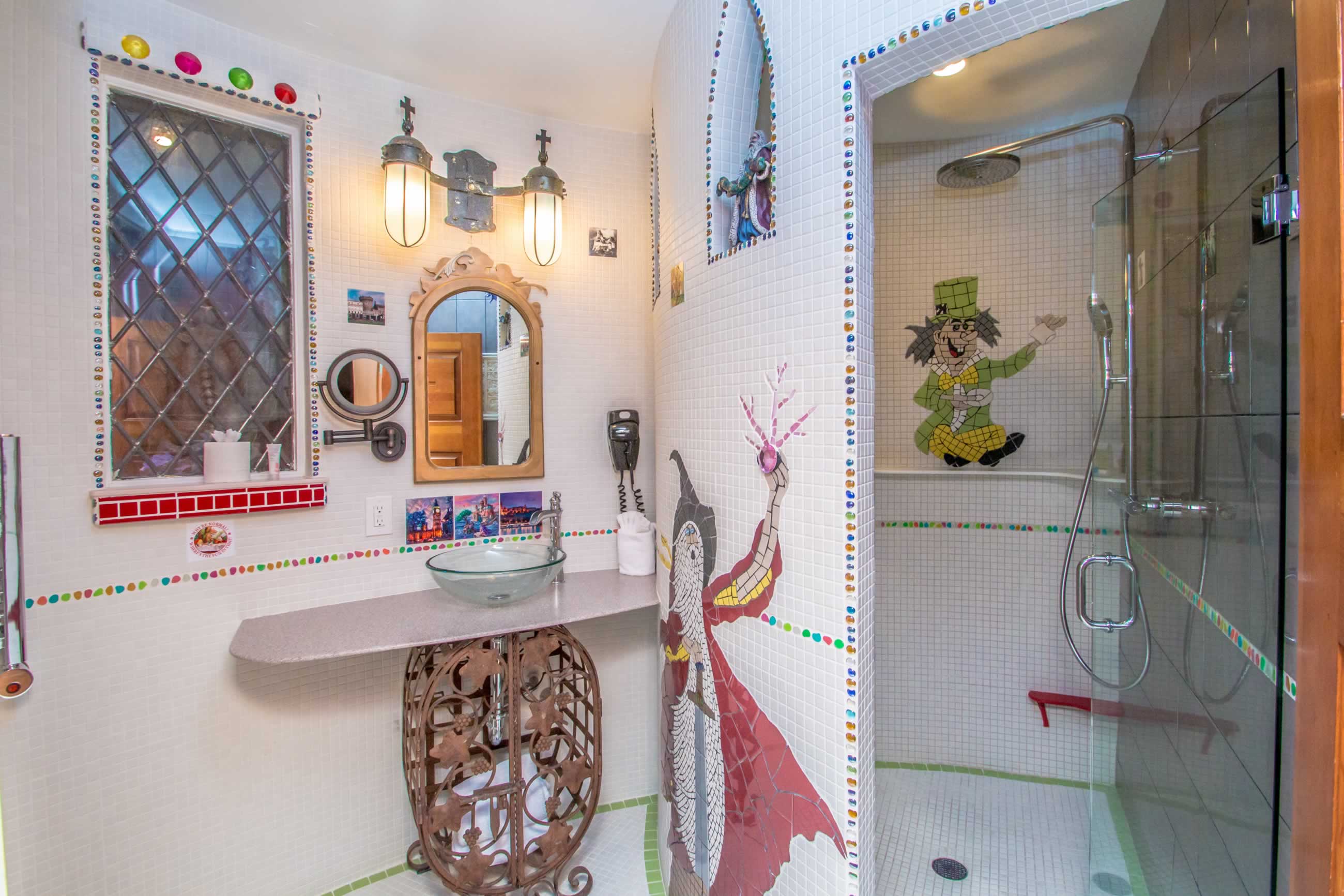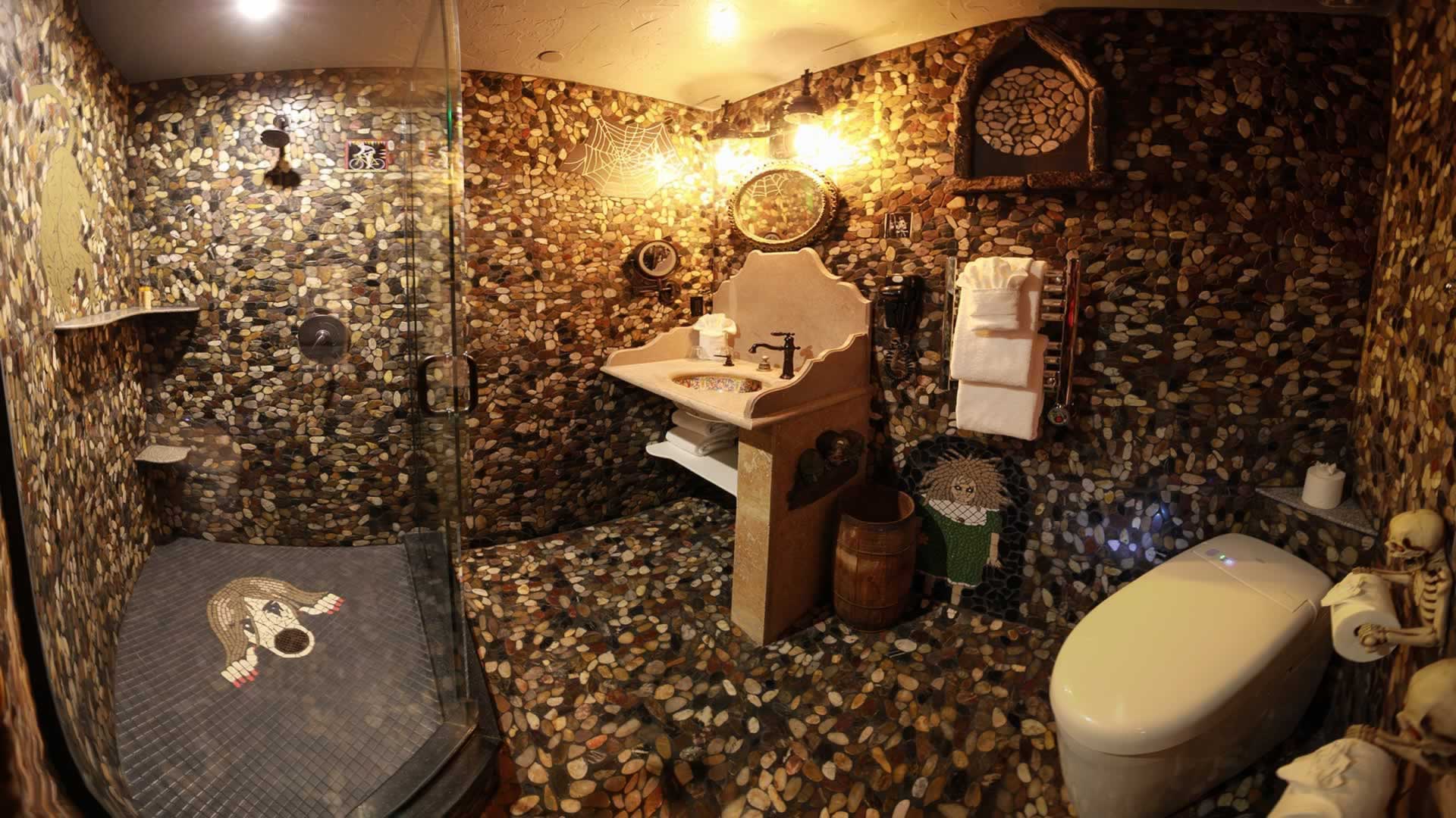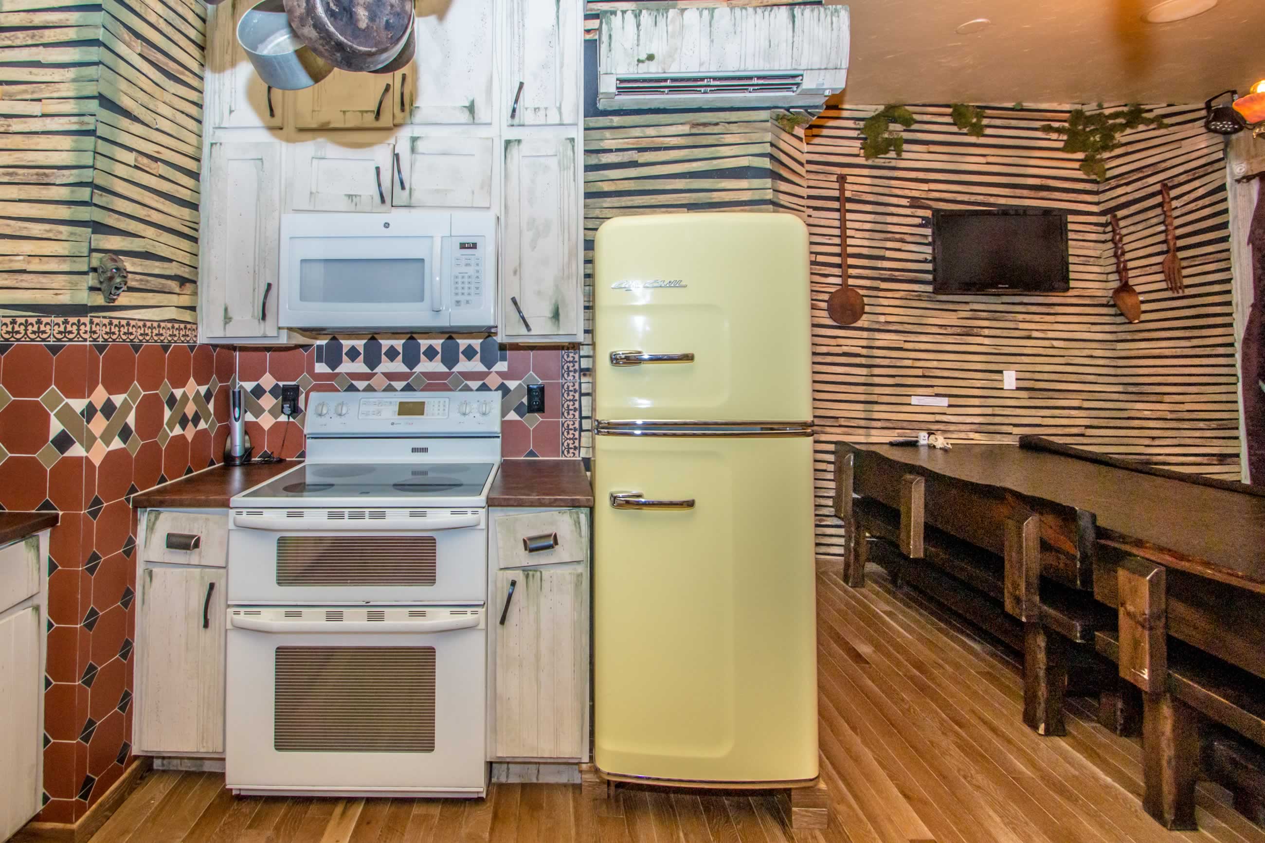 No expense has been spared in this project. Features includes a gangway bar overlooking the living area, 5 person, second story outdoor (covered) hot tub, the Kings "bone throne", 2 fireplaces, 3 bathrooms, sound-proof walls, a draw bridge leading to the 3 bedrooms (including the 3 tier Dormitorium), a full kitchen with a Kings' table, and unbelievable castle architecture...but this isn't the only reason you rent this amazing suite that sleeps up to 18 earthly people...It's because you WILL experience a haunting sensation .... GUARANTEED.