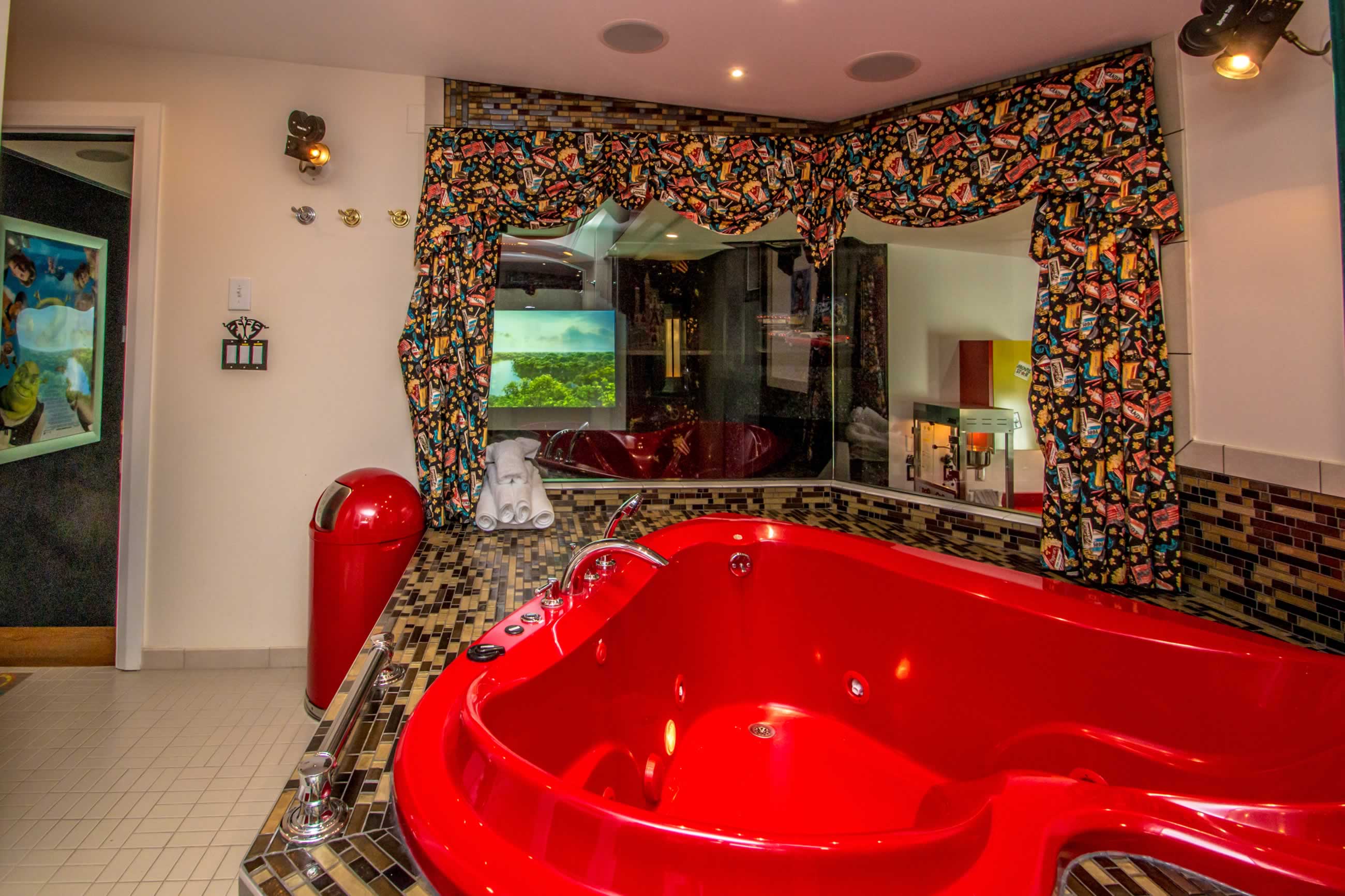 - Two-person jetted tub with view of projection screen or close the curtains for privacy