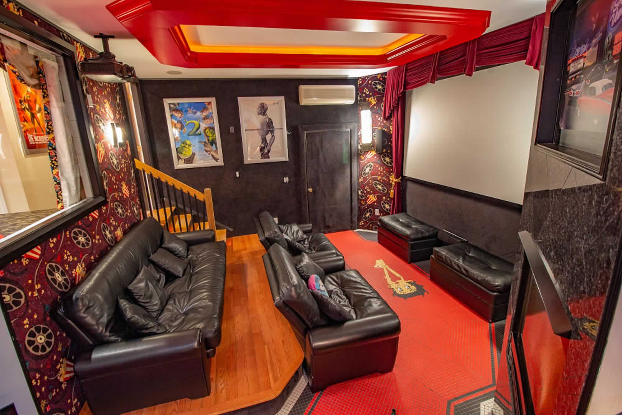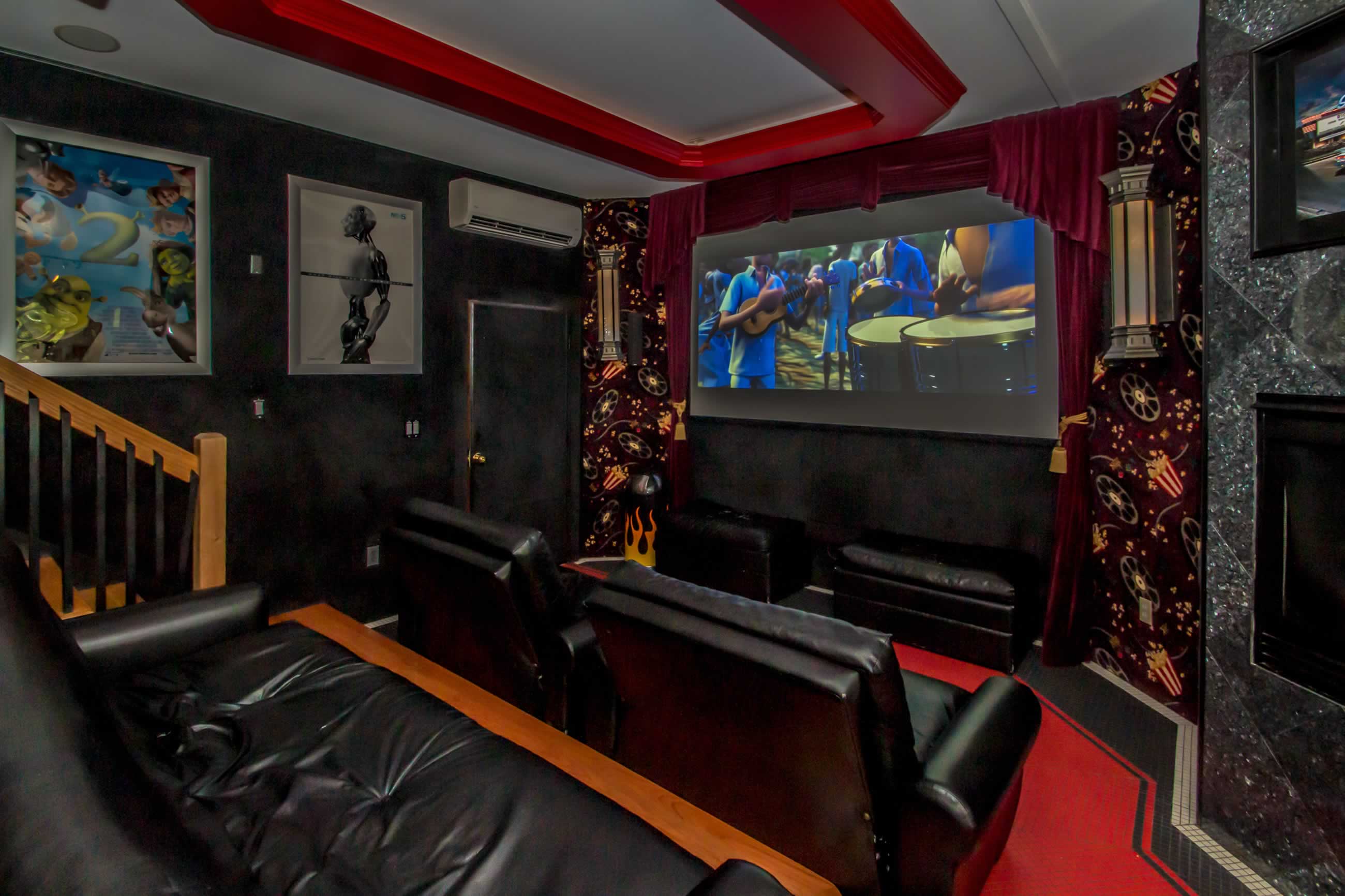 - 10-foot wall-mounted projection screen with surround sound, Blu-ray player and Stereo system
