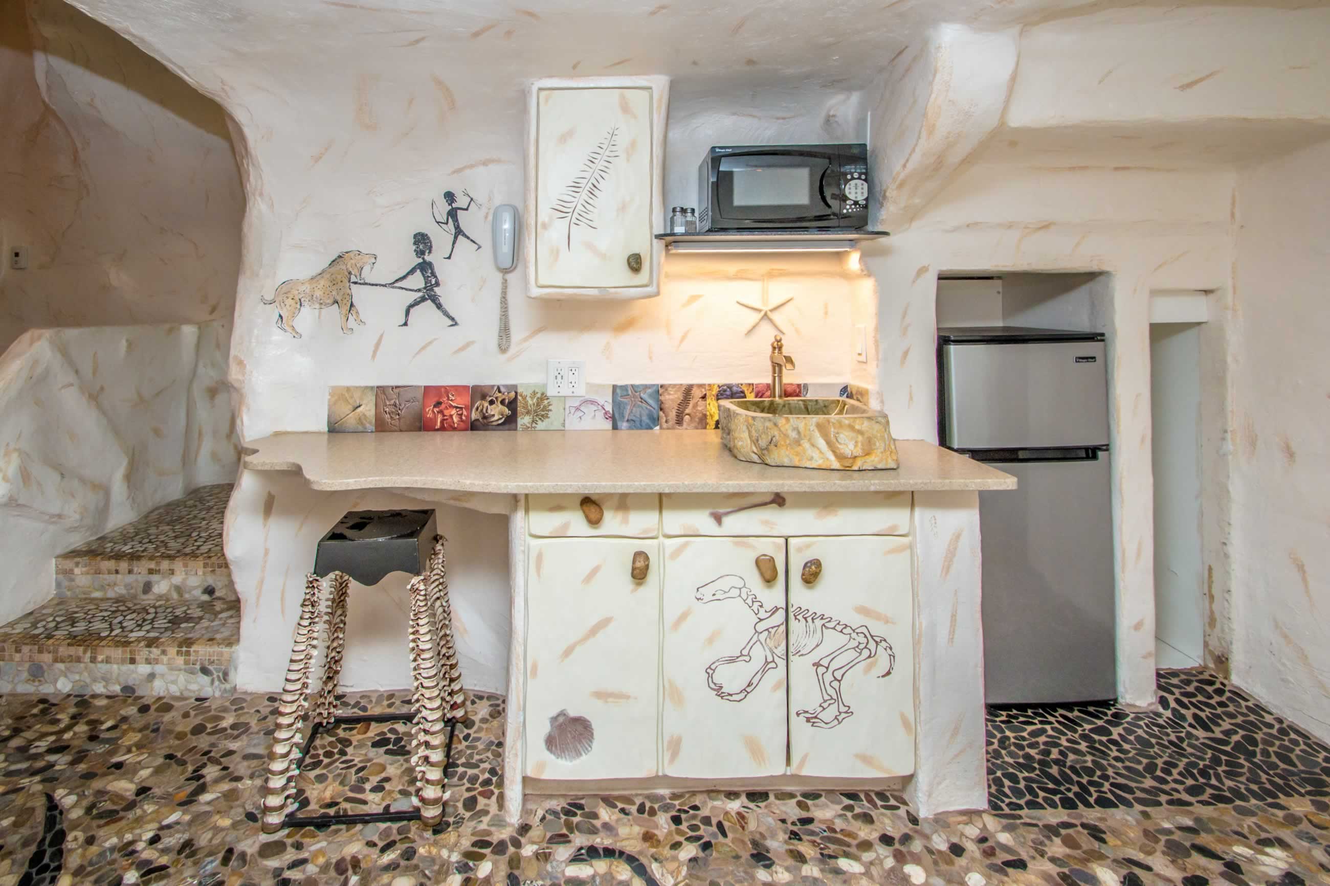 Go back in time and live in primal luxury with this fabulous suite for up to six guests. A two-story primitive paradise complete with stalactites, bats, bones, and more. Lose yourself amidst cave hieroglyphics, exotic creatures, ancient artifacts and dinosaurs while exploring the Tunnel, Den, Cavern and Grotto of this otherworldly realm. This suite features a 4-5 person hot tub, gas fireplace, waterfall shower and a kitchenette. Kids can sleep in the Cavern. The perfect getaway to enjoy with your favorite Neanderthals!